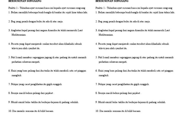 Soalan 1:tukarkan setiap ayat susunan biasa di bawah kepada ayat susunan songsang tanpa mengubah maksud asalnya. Tukarkan ayat bersusunan biasa di bawah kepada ayat bersusunan songsang. Peringatan, perubahan ayat biasa kepada ayat songsang berlaku tanpa ada .